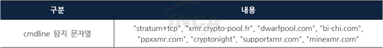 해당 샘플은 자신이 실행시킨 악성 채굴 프로세스를 제외한 프로세스의 cmdline 을 확인한 후, [표 1]에 속한 문자열이 있으면 가상 화폐 채굴 프로세스로 판단하여 종료시킨다. 이후 다운받은 악성 가상 화폐 채굴 프로그램을 실행하여 공격자의 지갑 주소로 설정된 채굴 작업을 진행한다.