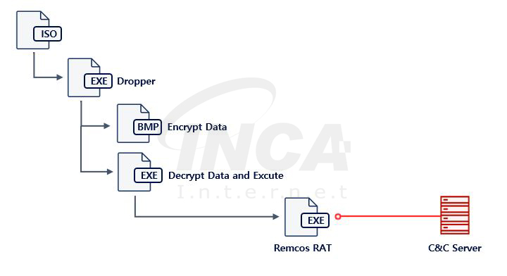 ISO 확장자로 압축된 파일 내부에는 PDF파일로 위장한 실행파일이 존재하는데, 해당 파일이 실행되면 암호화된 ‘F.bmp’ 이미지 파일과 ‘TVcard.exe’ 파일을 드롭 하고 실행한다. ‘TVcard.exe’가 실행되면 ‘F.bmp’ 파일을 복호화 해서 메모리상에 dll를 생성하고 로드한다. 그리고 암호화된 dll의 리소스 영역을 복호화 해 최종적으로 ‘Remcos RAT’ 악성코드를 실행한다. 해당 악성코드는 C&C 서버와 연결을 시도하며 원격 명령을 수행하지만 현재 서버가 차단되어 실제 동작은 하지 않는다.