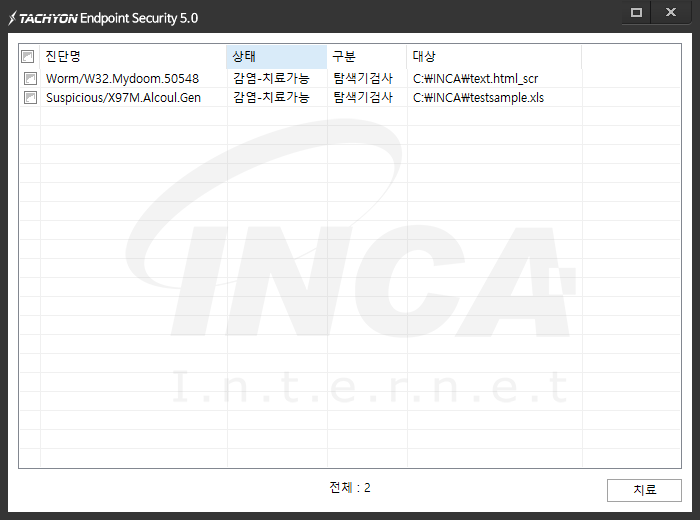 상기 악성코드는 잉카인터넷 안티바이러스 제품 TACHYON Internet Security 5.0에서 진단 및 치료가 가능하다.