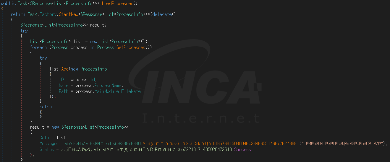 사용자 PC에서 실행중인 프로세스의 PID, 이름, 경로를 목록으로 작성하고 C&C 서버로 전송할 수 있으며 해당 프로세스의 PID를 이용해 특정 프로세스를 종료할 수 있다.