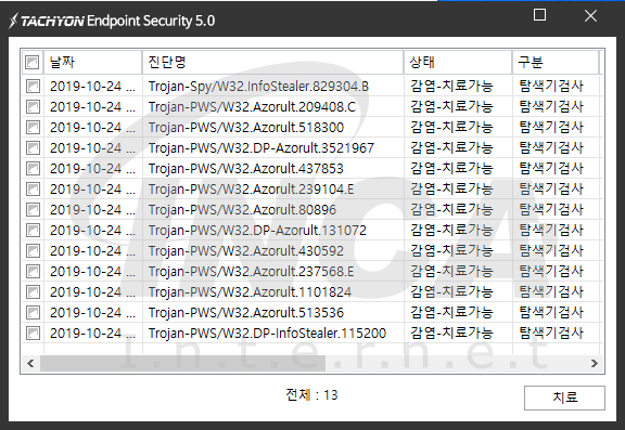 상기 악성코드는 잉카인터넷 안티바이러스 제품 TACHYON Internet Security 5.0에서 진단 및 치료가 가능하다.