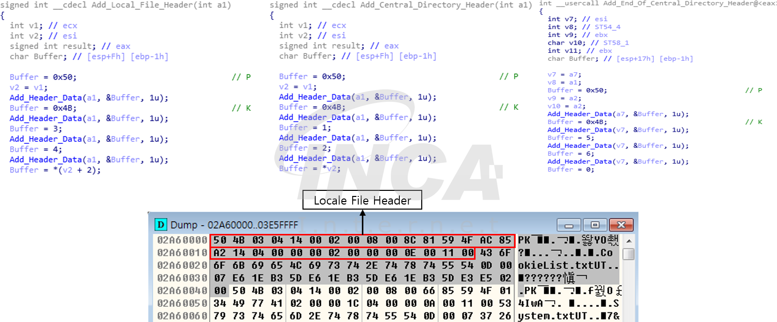 수집한 정보는 압축 파일 형식을 사용하여 데이터를 변환한다. ZIP 파일 구조의 Local File Heaer, Central Directory Header, End Of Central Directory_Header를 추가하는 코드가 [그림 4]와 같이 확인된다.