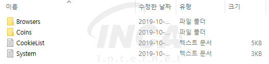 수집된 정보는 C&C 서버에 전송하기 전에 압축 파일 형식의 데이터로 변형된다. 압축 파일 데이터의 내용물은 [그림 3]과 같으며 2개의 폴더(Browsers, Coins)와 2개의 텍스트 문서(CookieList, System)로 구성된다.