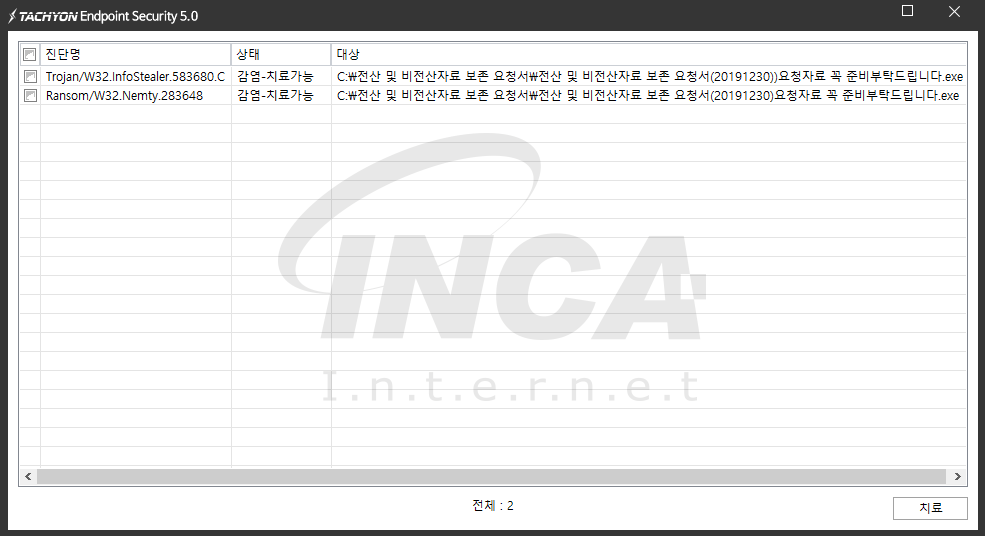 상기 악성코드는 잉카인터넷 안티바이러스 제품 TACHYON Endpoint Security 5.0에서 진단 및 치료가 가능하다.