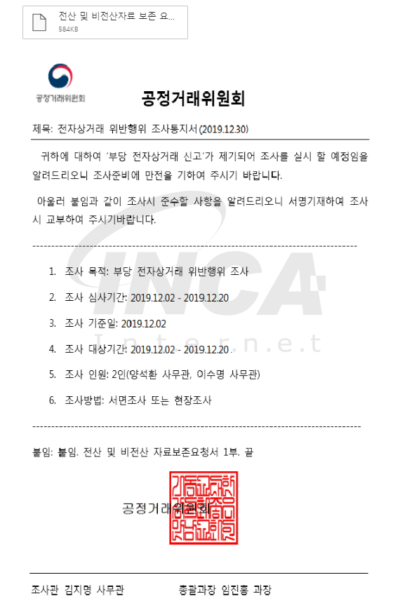 최근 “전자상거래 위반행위 조사통지서(19.12.30)”라는 제목으로 공정거래위원회를 사칭한 이메일이 발견되었다. 해당 메일은 공정거래위원회 로고, 도장 등 실제 공문과 유사하며, 첨부된 압축 파일은 정상 문서파일처럼 위장하여 사용자의 실행을 유도하고 있다. 첨부파일은 두 개의 파일로 이루어져 있으며 각각 랜섬웨어, 정보탈취의 악성 행위를 수행하고 있어 사용자의 주의가 필요하다.