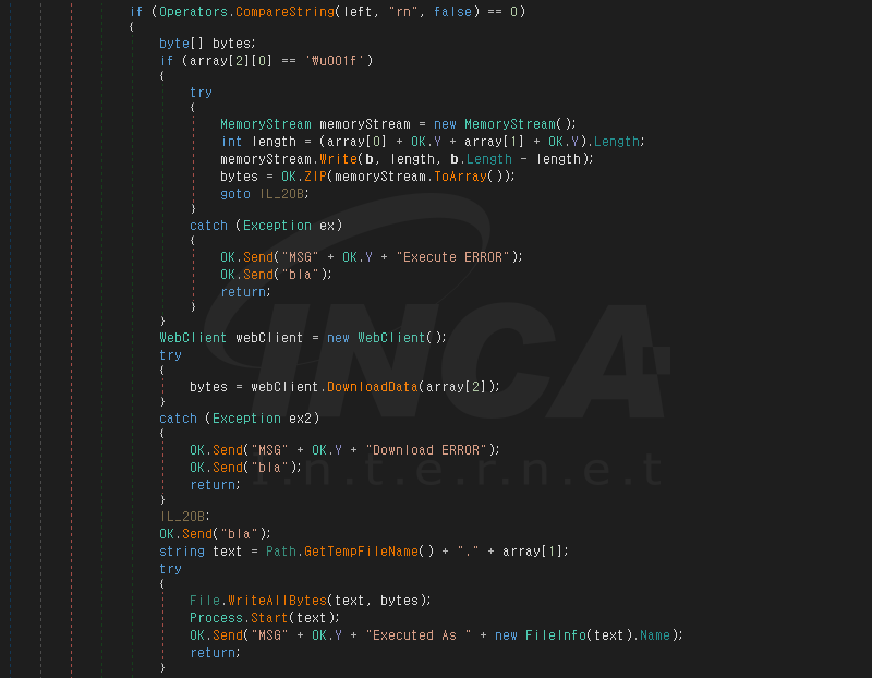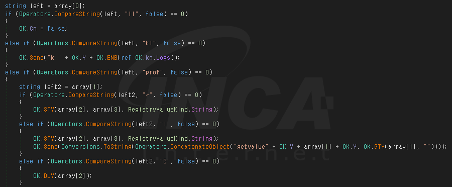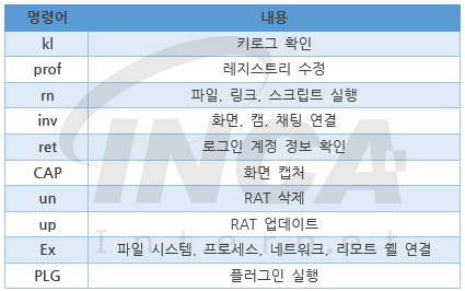 C2 서버의 명령에 따라 감염된 PC에 추가 파일을 다운 및 실행 할 수 있으며 수집한 키로그를 볼 수 있고, 레지스트리를 생성 및 삭제할 수도 있다. 이외의 C&C 명령은 아래 [표 1]과 같다.
