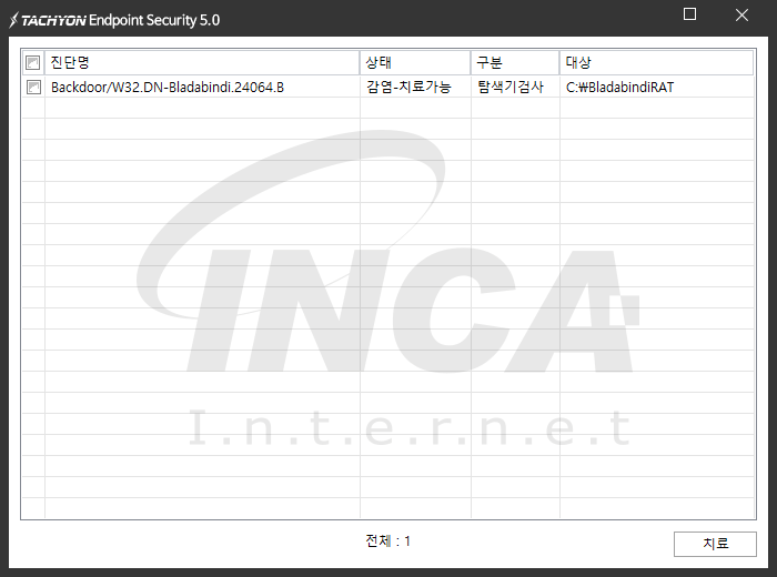 상기 악성코드는 잉카인터넷 안티바이러스 제품 TACHYON Internet Security 5.0에서 진단 및 치료가 가능하다.