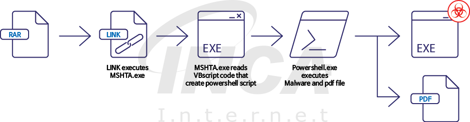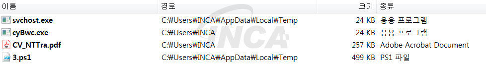 실행 과정을 보면, 링크 파일 내부에는 난독화 된 vb 스크립트가 hta 형식으로 작성되어있다. vb 스크립트 코드는 “%TEMP%” 경로에 파워쉘 스크립트(3.ps1)를 생성하고 실행한다. 생성된 파워쉘 스크립트를 확인해 보면, “%USERPROFILE%” 경로에 개인 정보가 기록된 정상 pdf 파일(CV_NTTra.pdf)과 ‘Bladabindi’로 알려진 악성 파일(cyBwc.exe)을 드롭하고 실행한다.