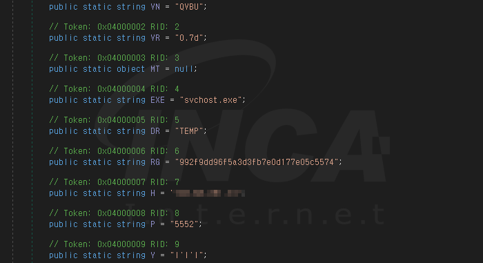 Bladabindi 악성코드는 내부에 C2 서버의 IP주소와 포트 번호, 악성코드가 실행될 파일명, 특정 값이 기록되어있다.