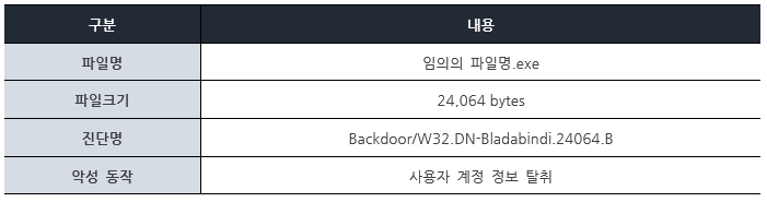 해당 악성코드는 피싱 메일의 첨부파일을 통해 유포될 것으로 추정된다.