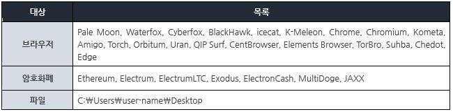 ‘Vidar’이 수집하는 정보는 웹 브라우저, 암호화폐, CC, 및 감염 PC의 파일 등이며 브라우저 및 암호 화폐의 수집 대상 목록은 [표 1]과 같다.