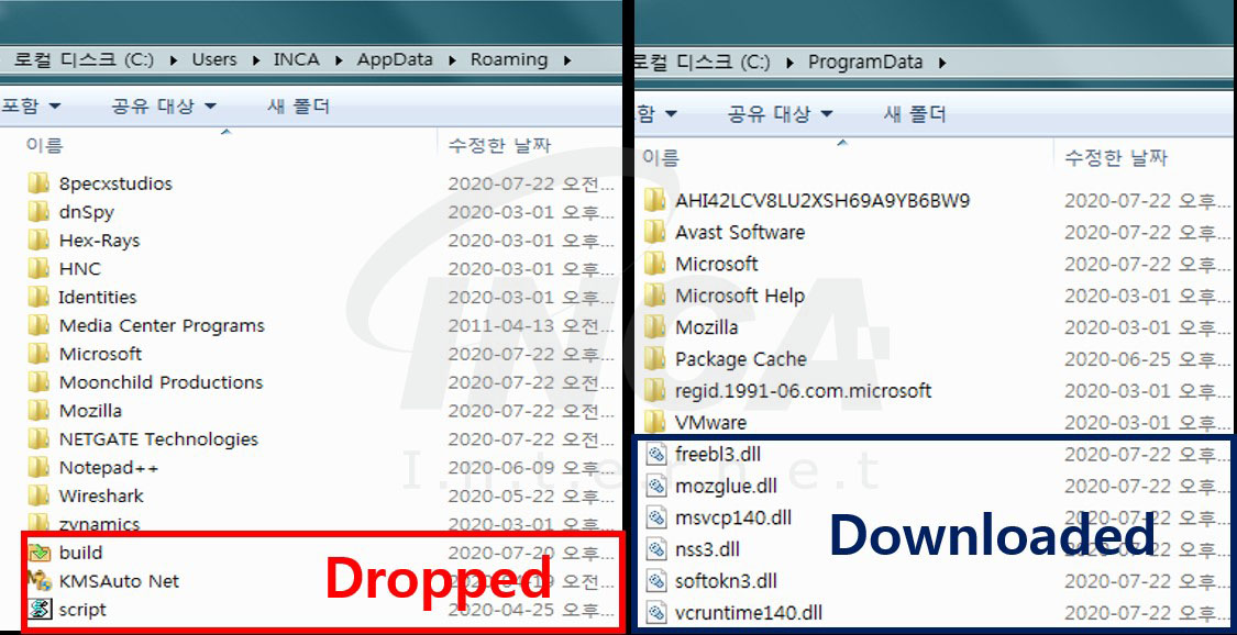 만약, 사용자가 비밀번호를 정상적으로 입력한 후, OK 버튼을 누르면 “C:\Program\Data” 에 3개의 파일이 드롭된다. 첫 번째 드롭 파일은 KMSAuto Net.exe v1.5.1 크랙판(KMSAuto Net.exe)이고, 두 번째 드롭 파일은 IP Logger를 사용하여 감염 PC의 네트워크 정보를 수집하는 스크립트 파일(script.vbs)이다. 마지막 드롭 파일인 ‘build.exe’는 정보 탈취를 하는 ‘Vidar’ 악성코드이고 감염 PC의 사용자 정보, 웹 브라우저 계정 정보 및 사용 이력, 암호 화폐 등의 다양한 정보를 수집하여 C&C 서버로 전송한다. 따라서, 사용자의 웹 브라우저 사용자 계정, 암호 화폐 등의 정보가 유출될 수 있으므로 사용에 큰 주의가 필요하다.