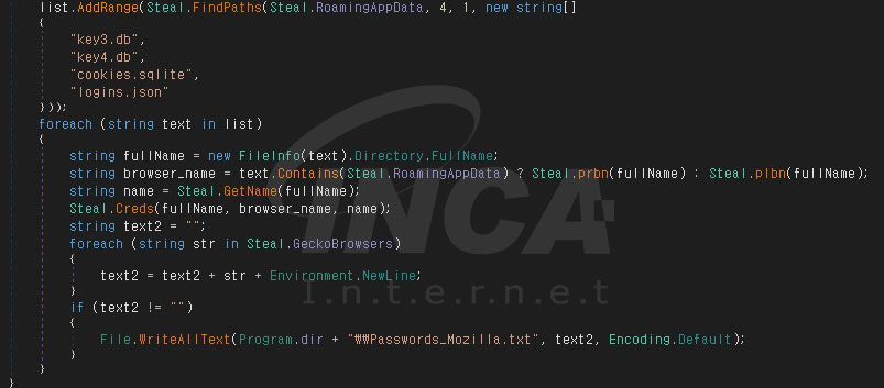Mozilla 브라우저에서 사용자 profile, login, password 및 cookies 정보를 탈취한다.