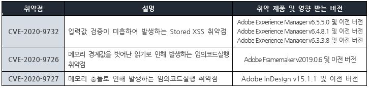 Adobe 사에서 보안 업데이트를 발표하고, 관련 취약점을 해결하기 위해 최신 버전으로 업데이트할 것을 권고하였다.