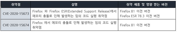 Mozilla는 Firefox에서 발생하는 취약점에 대한 보안 업데이트를 발표하고, 최신버전 업데이트를 권고하였다.