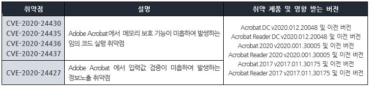 Adobe 사에서 보안 업데이트를 발표하고, 관련 취약점을 해결하기 위해 최신 버전으로 업데이트할 것을 권고하였다.