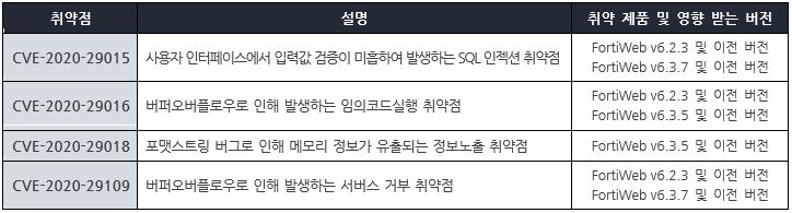 Fortinet사에서 보안 업데이트를 발표하고, 관련 취약점을 해결하기 위해 최신 버전으로 업데이트할 것을 권고하였다.