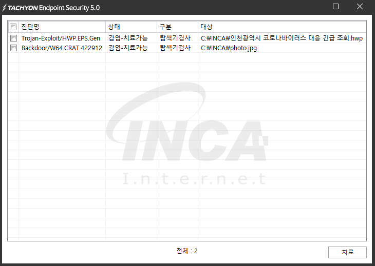 “CRAT” 악성코드는 잉카인터넷 안티바이러스 제품 TACHYON Endpoint Security 5.0에서 진단 및 치료가 가능하다.