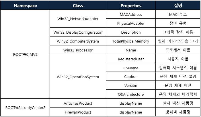 따라서 "WQL"을 사용하여 다음 [표 2]과 같이 네트워크 장치, 디스플레이, 컴퓨터 시스템, 프로세서, 운영체제 및 설치된 백신제품 등 사용자의 컴퓨터 정보와 보안 제품에 대한 정보를 수집한다.