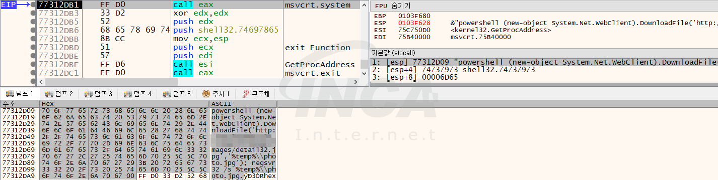Shellcode는 system 함수를 호출하여 Powershell 명령을 통해 공격자의 서버로 연결하여 “CRAT” 악성코드를 다운로드하고 실행한다.