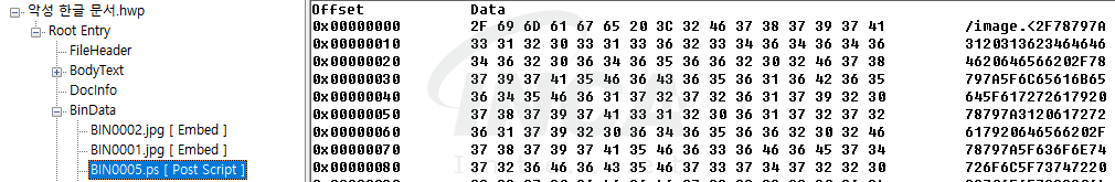 한글 프로그램에서는 그래픽 이미지를 화면에 표현하기 위해 EPS 파일을 사용한다. 공격자들은 한글 문서에 악성 EPS 파일을 삽입하고, EPS 파일이 9.21 이하 버전의 인터프리터(gbb.exe, gswin32c.exe)를 통해 실행되는 과정에서 발생하는 CVE-2017-8291 취약점을 이용하여 악성 동작을 수행한다.