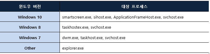 “CRAT”은 윈도우 버전에 따라, 아래 [표 1]의 대상 프로세스에 인젝션한다.