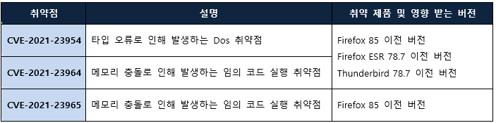 Mozilla는 제품에서 발생하는 취약점에 대한 보안 업데이트를 발표하고, 최신 버전 업데이트를 권고하였다.