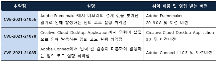 Adobe는 제품에서 발생하는 취약점에 대한 보안 업데이트를 발표하고, 최신 버전 업데이트를 권고하였다.