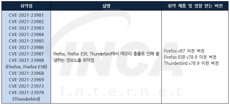 Mozilla 사는 제품에서 발생하는 취약점에 대한 보안 업데이트를 발표하고, 관련 취약점을 해결하기 위해 최신 버전으로 업데이트할 것을 권고하였다.