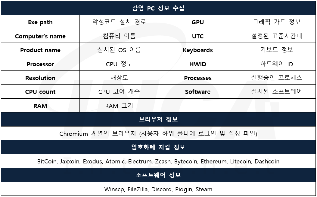 앞선 조건들을 만족한다면 다음 [표 2]와 같이 감염환경의 정보, 스크린샷, 브라우저, 암호화폐 지갑 및 소프트웨어 정보를 수집한다.