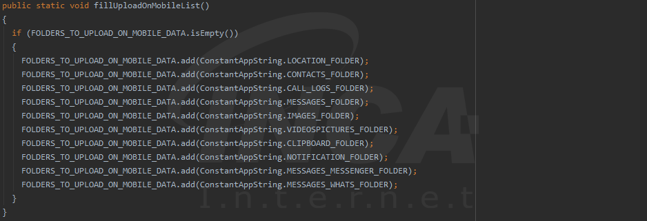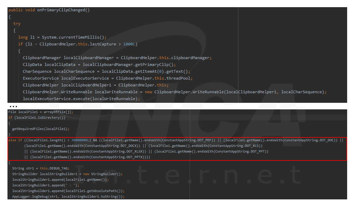 원격 제어에 사용되는 일부 코드들을 확인 해보면 사용자 단말기의 클립보드 내용을 확인하거나 파일 확장자(.pdf, .doc, .docx, .xls, .xlsx, .ppt, .pptx )를 비교하여 검색한다. 해당 내용들은 추후 설치 된 폴더에 보관된다.