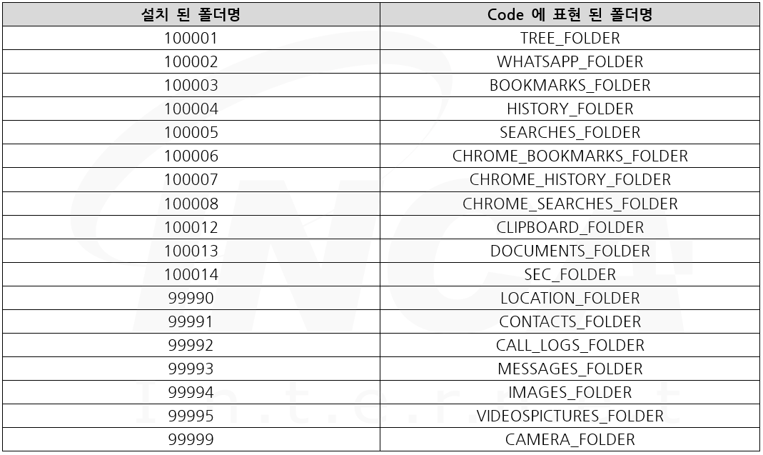 설치 된 폴더에는 북마크 목록, 검색 기록 목록, 문서 목록, 사용자 위치 정보 목록, 통화 기록, 사진 정보, SMS 정보 등이 보관되며 탈취 대상이 된다.