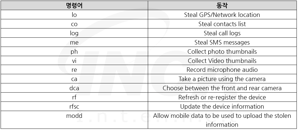 해당 악성 앱은 사용자 환경의 정보들을 탈취하기 위하여 Firebase 원격지에서 데이터를 입력 받아 제어 하도록 구성되어 있다. 원격 제어 명령어들을 확인 해 본 결과, 다양한 정보들을 제어 한다.