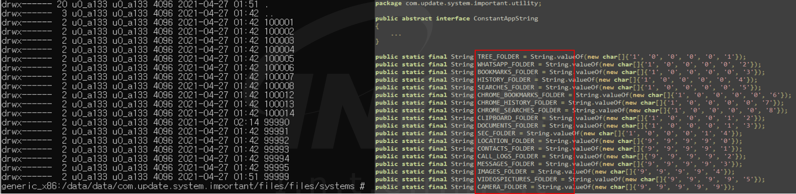 주요 목적이 정보 탈취인 만큼, 악성 앱이 설치 되면 다음의 경로에 여러가지 숫자로 된 폴더를 만들어 탈취할 내용들을 보관한다. ( 경로 : “/data/data/com.update.system.important/files/files/system/FOLDER_NAME” )