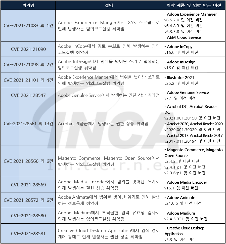 Adobe 사는 제품에서 발생하는 취약점에 대한 보안 업데이트를 발표하고, 관련 취약점을 해결하기 위해 최신 버전으로 업데이트할 것을 권고하였다.