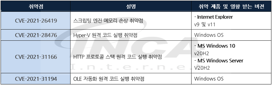 Microsoft 사는 제품에서 발생하는 취약점에 대한 보안 업데이트를 발표하고, 관련 취약점을 해결하기 위해 최신 버전으로 업데이트할 것을 권고하였다.