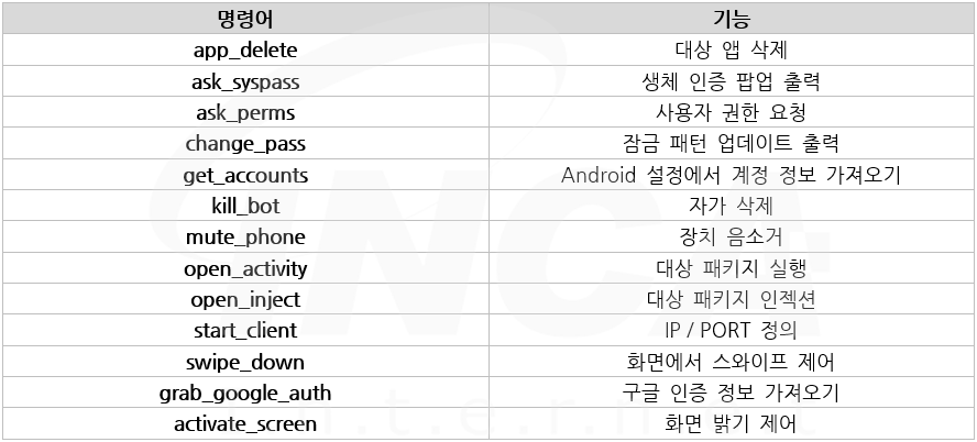 그 후, 해당 단말기의 정보를 확인하여, 각각의 단말기 별로 오버레이 공격을 수행한다. 오버레이 공격 기법은 정상적인 애플리케이션 화면 위에 악성코드가 제공하는 가짜 화면을 출력하여 사용자에게 정보 입력을 유도하여 탈취하는 방법을 말한다.