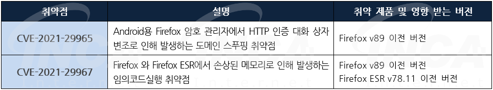 Mozilla 사는 제품에서 발생하는 취약점에 대한 보안 업데이트를 발표하고, 관련 취약점을 해결하기 위해 최신 버전으로 업데이트할 것을 권고하였다.