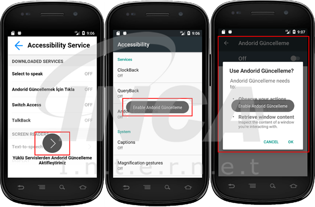 생성된 Webview는 다음과 같이 사용자 단말기에 보여진다. 화면은 좌에서 우로 진행되며 붉은 상자에 버튼을 눌러 권한을 획득한다.