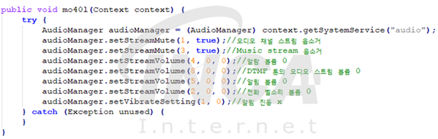 그리고 사용자 단말기를 무음으로 세팅하여 악성 동작이 진행되는 동안 사용자 눈에 띄지 않도록 한다.