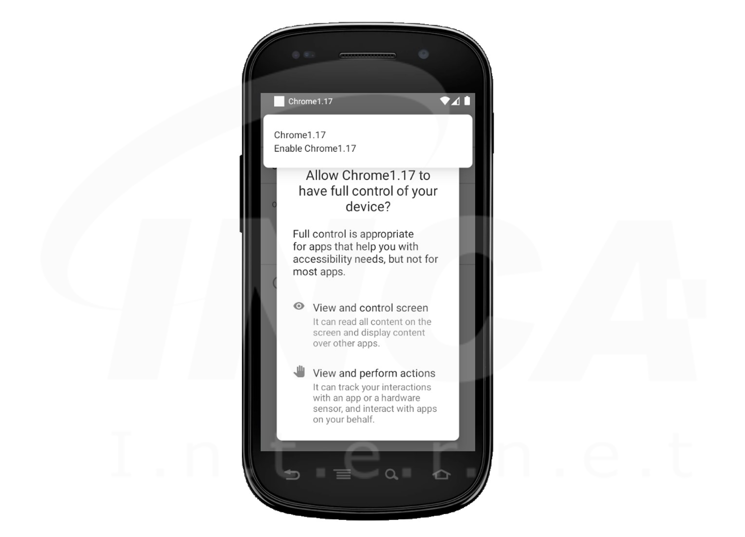 Chrome 을 사칭한 악성앱을 실행하면 가장 먼저 사용자에게 접근성 서비스 권한을 요청한다. 이는 접근성 서비스기능을 악용하여 사용자의 동의 없이 여러 악성 행위에 사용할 수 있다.