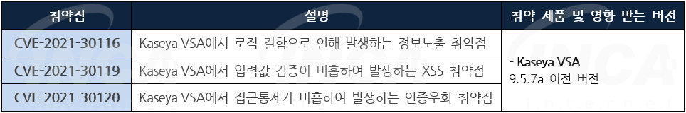 Kaseya 사는 Kaseya VSA (원격 모니터링 및 관리 솔루션) 제품에서 발생하는 취약점에 대한 보안 업데이트를 발표하고, 관련 취약점을 해결하기 위해 최신 버전으로 업데이트할 것을 권고하였다.