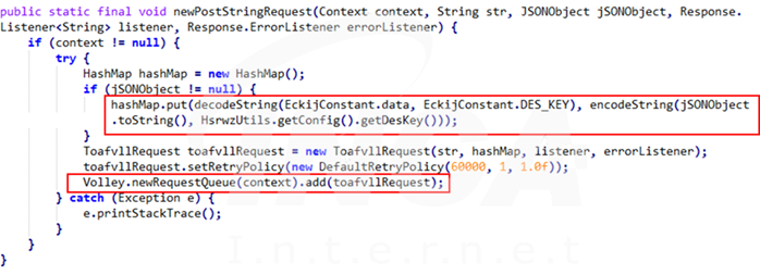 이렇게 수집한 데이터는 DES KEY로 인코딩한 다음, Volly 라이브러리를 통해 원격지 서버에 전송한다.