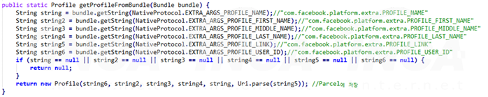 Access Token을 통해 권한을 획득하였기에 Facebook의 여러가지 정보에 접근 할 수 있다. 그 중, 아래의 코드를 보면 사용자 프로필 정보를 획득한다.