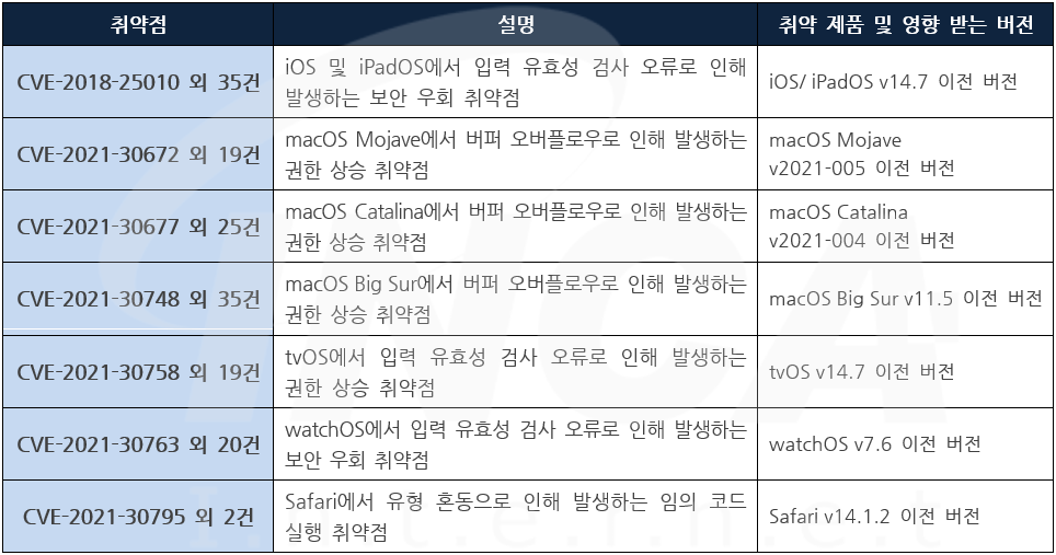 Apple 사는 제품에서 발생하는 취약점에 대한 보안 업데이트를 발표하고, 관련 취약점을 해결하기 위해 최신 버전으로 업데이트할 것을 권고하였다.