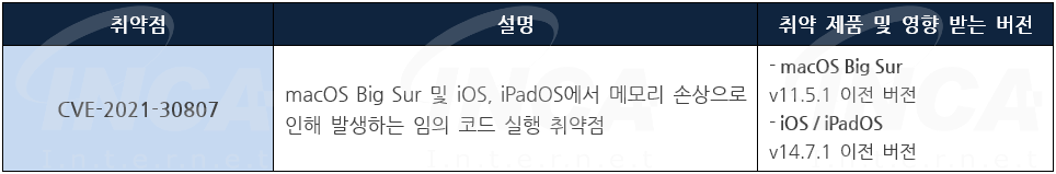 Apple 사는 제품에서 발생하는 취약점에 대한 추가 보안 업데이트를 발표하고, 관련 취약점을 해결하기 위해 최신 버전으로 업데이트할 것을 권고하였다.