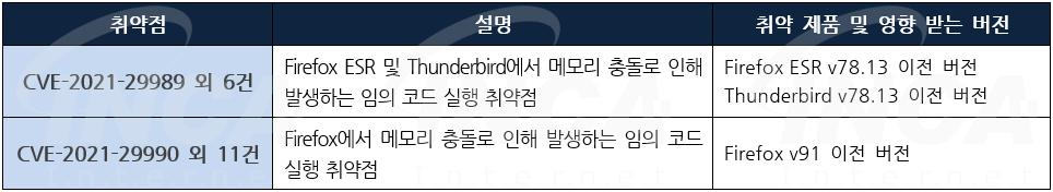 Mozilla 사는 제품에서 발생하는 취약점에 대한 보안 업데이트를 발표하고, 관련 취약점을 해결하기 위해 최신 버전으로 업데이트할 것을 권고하였다.