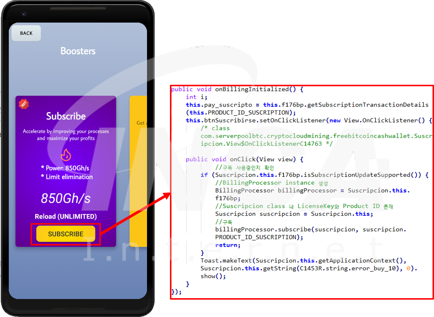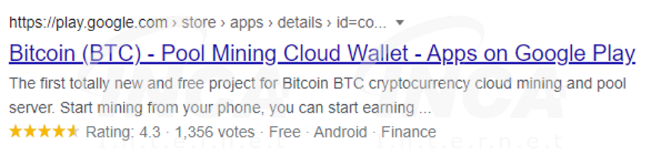 최근 국내외에서 암호화폐에 대한 관심이 높아지면서 이를 악용하여 암호화폐 채굴 앱을 위장한 악성 앱이 등장하였다. 해당 앱은 Google Play에서 판매되었으며, 10,000건이 넘는 다운로드를 기록한 것으로 알려졌다. 또한, 9개 이상 유사한 형태의 악성 앱이 유포된 것으로 밝혀졌다. 유포된 앱들은 암호화폐 채굴의 동작은 하지 못하지만, 사용자를 속여 구독 및 구매를 유도하거나 광고를 띄우는 등의 금전적 이익을 취하는 악성 동작을 수행한다.